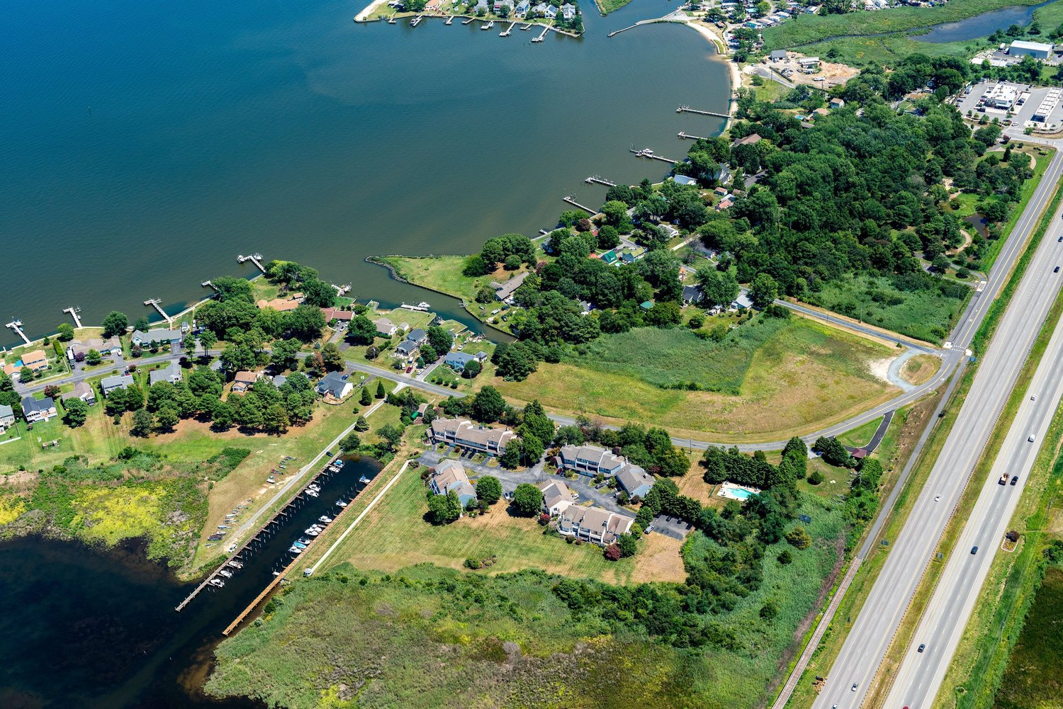 An aerial view of Long Point, with the undeveloped lot in question sandwiched between Queen Anne’s County Long Point Community Park, residential waterfront homes, and a new condominium complex. Photo courtesy of David Almy.